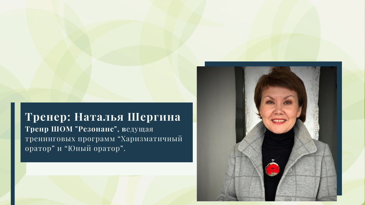 ТРЕНИНГ ВЕДЁТ: Наталья Шергина, тренер ШОМ "Резонанс", ведущая тренинговых программ "Харизматичный оратор" и "Юный оратор".